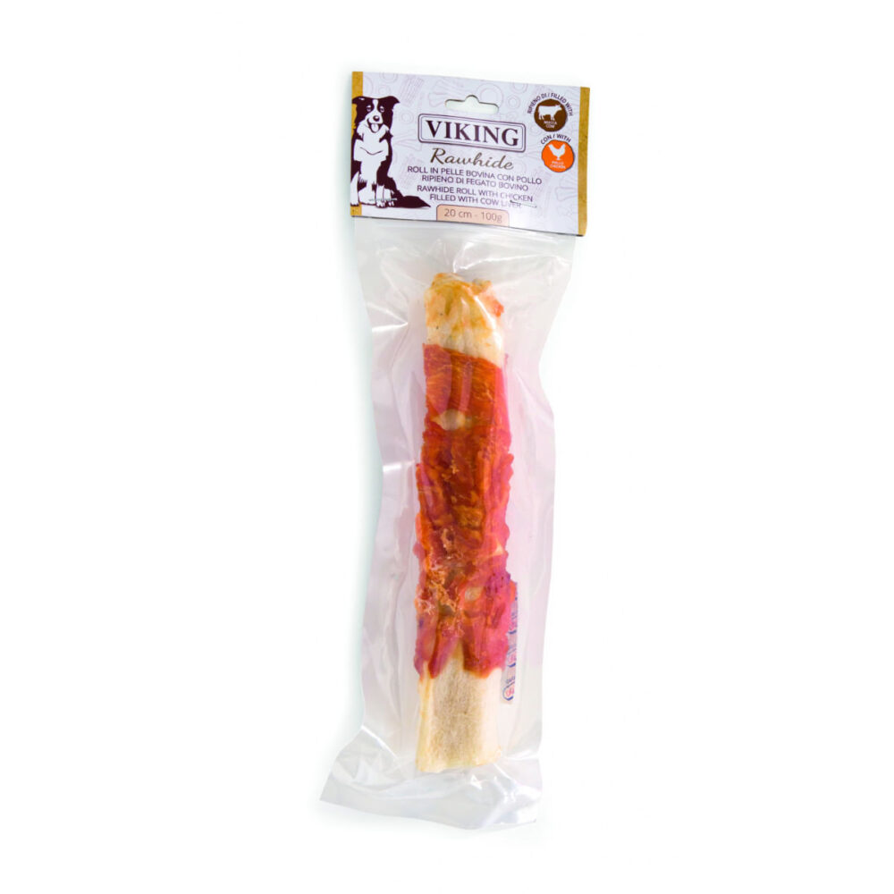 LEOPET Viking Rawhide Roll Filled, M-XL, Pui și Ficat de Vită, punguță recompense fără cereale câini, 100g