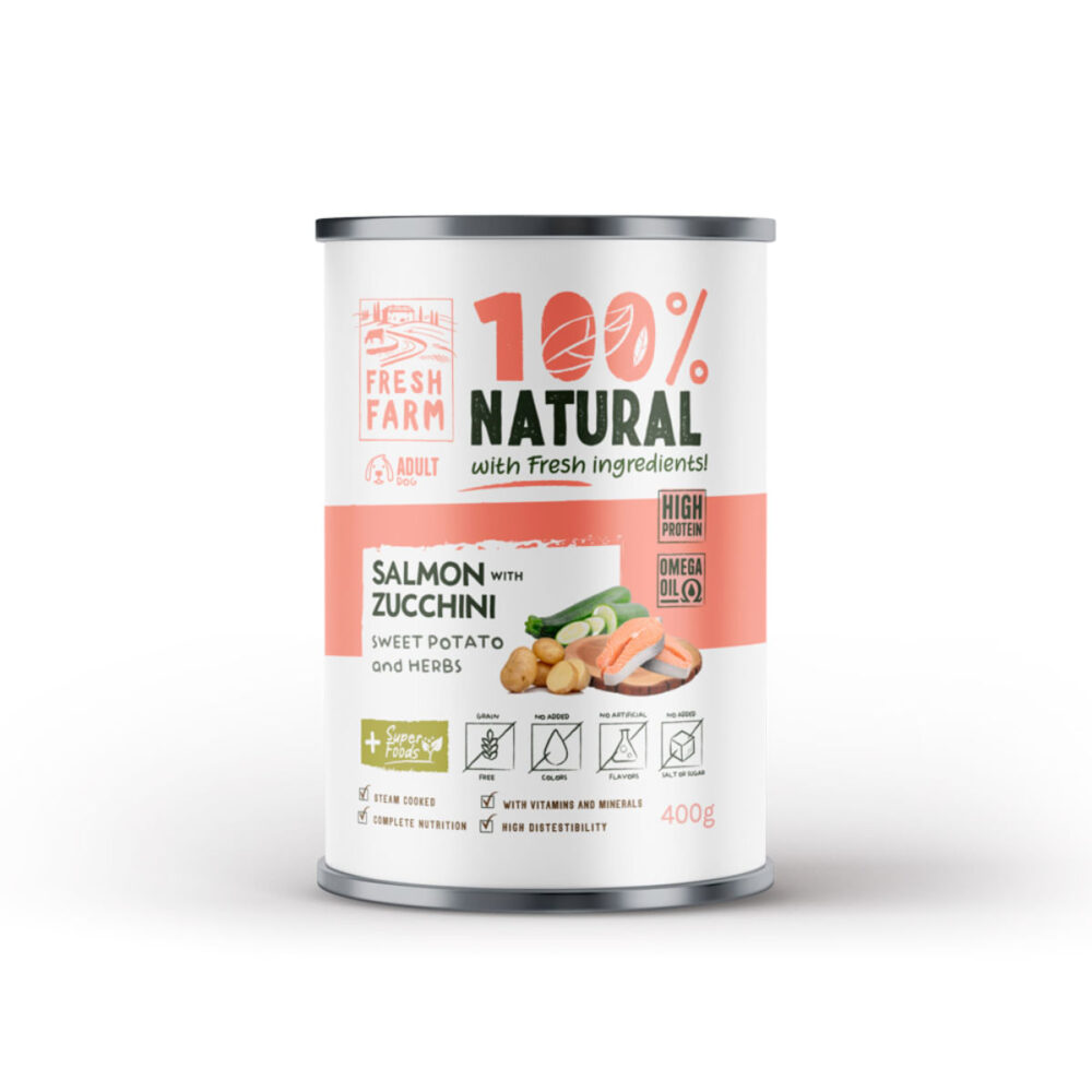 FRESH FARM Coarse, XS-XL, Somon și Cartof Dulce, conservă hrană umedă fără cereale câini, (pate), 400g
