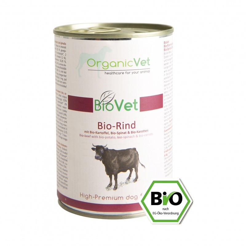 OrganicVet BIOVET – Vita, cartofi, spanac, morcovi organici Hrana super-premium cu ingrediente usor digerabile. Din agricultura certificata biologic/ecologic. Compozitie: carne si subproduse de origine animala 32% vita, legume 3% cartofi, 2% spanac, 2% morcovi, minerale 1%. Componente analitice: proteina 10.2%, grasime 6.5%, cenusa 2.4%, fibre 0.4%, umiditate 75%. Aditivi nutritionali/kg: Vit D3 200 IE, sulfat de zinc (monohidrat) 15mg, sulfat de mangan 3mg, iodat de calciu 0.75mg, selenit de sodiu 0.03mg. Metoda de hranire (greutate animal in kg/cantitatea zilnica de hrana in gr): 10kg/400gr; 20kg/800gr; 30kg/1200gr; 40kg/1600gr.