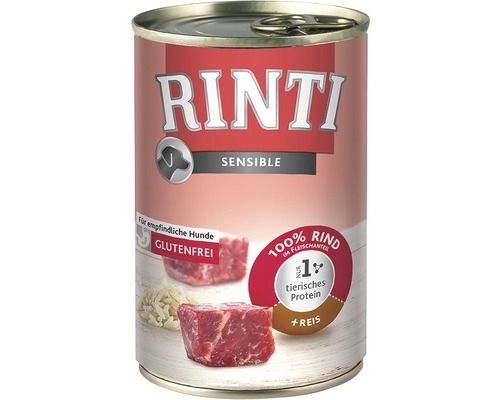 Hrana umeda pentru caini Rinti Sensible cu vita si orez 400 g reprezinta o alimentatie naturala, destinata cainilor adulti cu sensibilitatea digestiva.nCaracteristici si beneficii hrana umeda Rinti Sensible:nnHrana superpremium, completa destinata cainilor cu digestie sensibila, cu alergii sau intolerante provocate de componentele hranei;nGama sensible contine o singura sursa de proteina de origine animala;nNu contine ingrediente cu potential alergogen: gluten, soia , coloranti, conservanti sintetici, arome artificiale, organisme modificate genetic;nContine o singura sursa de carbohidrati fara potential alergogen.nnCaracteristici si beneficii hrana umeda pentru caini Rinti Sensible cu vita si orez 400 g:nnProdus monoproteic, o singura sursa de proteina, cea de vaca, ofera avantajul includerii hranei in dieta cateilor adulti ce manifesta sensibilitate fata de proteina de origine animala cu exceptia celei de vaca;nFara cereale cu potenial alergogen. Cainii nu au capacitatea de a digera cerealele precum graul , porumbul, orzul, ovazul, ba mai mult acestea contin gluten care sensibilizeaza tractul digestiv marind predispozitia acestor animale la a dezvolta alergii. Rinti a inlocuit cerealele cu potential alergogen cu orezul, acesta fiind singura cereala care nu produce alergii. Carbohidratii din orez reprezinta o buna sursa de energie pentru organism;nDigestibilitate crescuta, fara fermentatii digestive. Ingredientele de calitate superioara au un grad ridicat de descompunere fiind usor asimilate si rapid valorificate de catre organism. Fibrele (orez) mentin sanatatea bacteriilor benefice de la nivel intestinal, imbunatatesc digestia si absorbtia nutrientilor, asigura un tranzit intestinal normal si reduc diareea sau constipatia;nNivelul proteic ridicat sustine dezvoltarea masei musculare si reduce riscul de ingrasare. Carnea de vita este bogata in carnitina, aminoacid ce disponibilizeaza grasmile din depozite si intensifica arderea acestora. Fibrele mentin senzatia de satietate, reduc colesterolul si nivelul glicemiei prevenind ingrasarea, diabetul si afectiunile cardiovasculare;nPrevine anemia. Ficatul este un organ cu o valoare nutritionala ridicata, este bogat in vitamina B12 si fier (de cinci ori mai mult fier decat in carne) ce sustin formarea globulelor rosii.nnAditivi nutritionali (per kg): Vitamina D3 200 IE, zinc (oxid de zinc) 13 mg.n Constituenti analitici: nnnnnProteinen7 %nnnGrasimin6 %nnnFibren0.5 %nnnCenusan2 %nnnUmiditaten80 %nnnnnCompozitie: Vita 59% (maruntaie, ficat, muschi, rinichi, plamani), orez 5%, minerale.