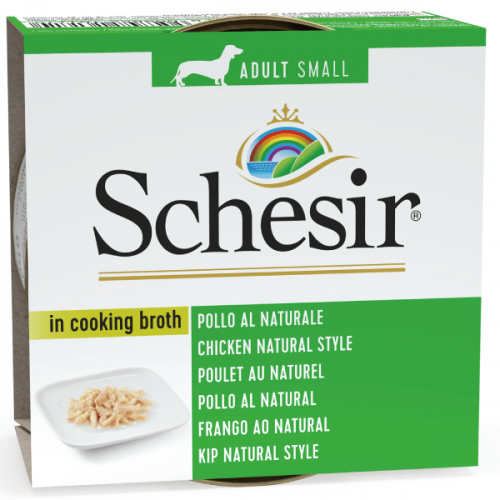 Hrana umeda pentru caini Schesir Adult Small Pui 85g – Hrana complementara din bucati in supa pentru caini adulti de talie mica. Compozitie: pui 60%, orez 1,5%.