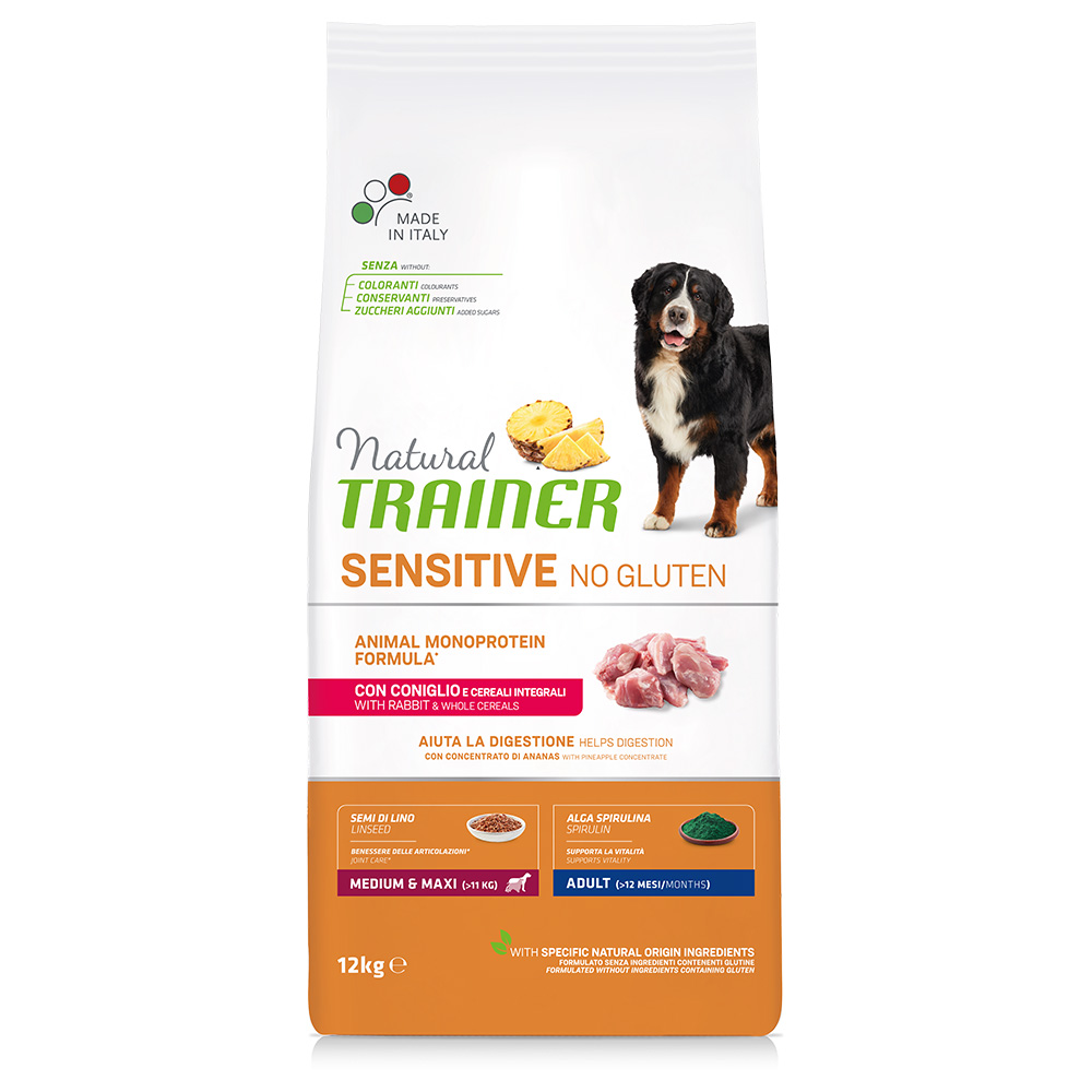 Natural Trainer Sensitive Adult Medium/Maxi cu iepure este hrana uscată ideală pentru câini de talie medie și mare care se confruntă cu afecțiuni alimentare. Utilizată în special de proprietarii care doresc să îmbunătățească sănătatea digestivă a câinelui, această rețetă monoproteică oferă o sursă unică de proteine animale, iepurele, care este foarte bine tolerat de către câinii cu alergii sau intoleranțe. Oferind o digestie ușoară și rapidă, această hrană contribuie la menținerea unui tranzit intestinal sănătos, eliminând problemele digestive frecvente.Susținerea sănătății pielii și blănii