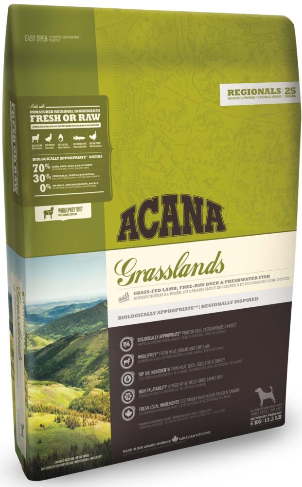 ACANA Hrană uscată GRASSLANDS pentru câini, fără cerealeHrană completă, biologic apropiată pentru câini.Prin natura lor toţi câinii sunt carnivori, adaptaţi biologic la hrana bogată şi variată în carne proaspătă cu mici cantităţi de fructe şi ierburi. De aceea ACANA GRASSLANDS este încărcată cu miei crescuţi liberi, raţe crescute pe păşune, ouă din cuibar şi peşti sălbatici, toate acestea crescute sau pescuite şi livrate proaspete, zilnic la porţile bucătăriei pentru a hrăni perfect câinele tău.COMPOZIȚIE: carne crudă de miel hrănit cu iarbă (8%), raţă proaspătă (8%), ouă proaspete (8%), făină de carne de miel (8%), făină de hering integral (7%), făină de curcan (7%), mazăre verde integrală, linte roşie integrală, năut integral, ştiucă nordică integrală pescuită din sălbăticie (4%), ficat crud de miel (4%), organe proaspete de raţă (ficat, inimă, rinichi) (4%), făină de curcan proaspăt (4%), grăsime de miel (4%), linte verde integrală, fasole pinto integrală, mazăre galbenă integrală, lucernă uscată, ulei de pollock (2%), fribră din linte, cartilagii deshidratate de miel (1%), burtă de miel crudă (1%), varec brun deshidratat, devlecel zucchini proaspăt, dovleac proaspăt, păstârnac proaspăt, varză creaţă verde proaspătă, spanac proaspăt, seminţe de muştar proaspăt, nap proaspăt, morcov proaspăt, mere red delicious proaspete, pere bartlett proaspete, ficat liofilizat (miel şi raţă) (0,1%), afine integrale proaspete, coacăze integrale proaspete, rădăcină de cicoare, turmeric, ciulinul laptelui, rădăcină de brusture, lavandă rădăcină de nalbă mare, măceşe.ADITIVI (per kg): aditivi nutriţionali: vitamina E 100 UI, E6 (zinc) 100mg, E4 (cupru) 10mg. Aditivi zootehnici: Enterococcus faecium NCIMB10415 300 M CFU/kg.CONSTITUENȚI ANALITICI: proteine 35%, conţinut de grăsimi 17%, cenuşă brută 8%, fibră brută 6%, calciu 1,7%, fosfor 1,2%, Omega 6 2,3%, Omega 3 1%, DHA 0,2%, EPA 0,2%, glucozamină 600 mg/kg, condroitină sulfat 800 mg/kg.CANTITATEA ZILNICĂ RECOMANDATĂ:Greutatea corporală a câinelui în kg = cantitatea de produs în grame/zi pentru un câine cu activitate fizică normală / activitate fizică redusă.2-5 kg = 60 – 90 g / 30 – 60 g6-10 kg = 115 – 160 g / 70 – 120 g11-20 kg = 175 – 280 g / 130 – 180 g21-40 kg = 285 – 480 g / 190 – 320 g41-60 kg = 495 – 640 g / 330 – 420 g