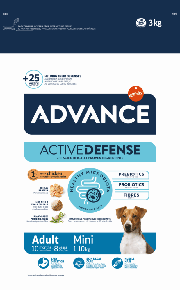 Avantajele Advance Dog Mini Adult:nnNivelul de proteine si cel de grasimi sunt echilibrate, pentru o mentinere optima a cainelui adult.nGranulele mici sunt adaptate dentitiei cainilor de talie mica.nCu carne de pui (20%) si orez (15%)nCu cantitate mare de proteine (28%) si grasimi (18%), pentru necesarul crescut al cainilor de talei mica.nSistemul „celullar antiaging” cu anitoxidanti, pentru o viata mai lunga si de calitate superioara.nImunoglobuline si prebiotice (fibre)pentru a proteja sanatatea intestinului si intarirea sistemului imunitarnAcizi grasi esentiali (omega 3) si taurina pentru un sistem nervos echilibrat si inima sanatoasa.nProtectie dentara prin priofosfati, care previn depunerea tartrului.