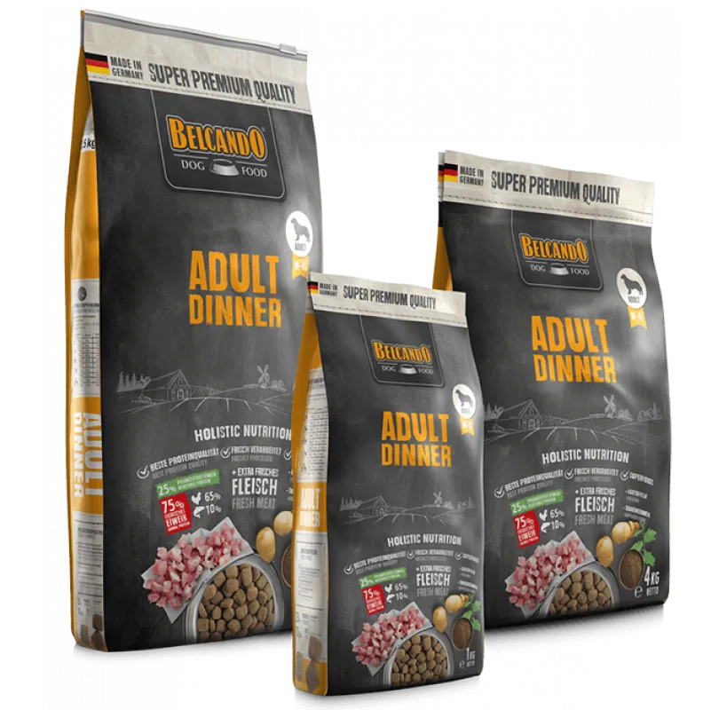 Belcando Adult Dinner Selectarea atentă a materiilor prime, o bogăţie de carne fragedă de pasăre , cartofi sănătoşi şi făină de seminţe de struguri presate la rece fac din Belcando Adult Dinner combinaţia ideală de nutrienţi pentru câini adulţi. Conținutul limitat de proteine și grăsimi este adaptat cerințelor nutriționale ale câinilor cu nivel normal de activitate. În cazul în care hrana este administrată în cantitățile corecte, greutatea câinelui va rămâne constantă și nivelul de sațietate va fi adecvat. Crochetele de dimensiuni mai mari încurajează câinele să mestece. Procent de proteină animală din proteină totală: 75% (din pasăre 60%, din pește 10%) Caracteristici: Energie moderată pentru câini cu activitate normală – proporția echilibrată de proteine (23%) și grăsimi (10,5%) menține vitalitatea câinelui; Protecție celulară activă – conținutul de făină din sâmburi de struguri protejează celulele de efectele radicalilor liberi; Susținere digestivă optimă – cu carne de pasăre ușor digerabilă și amidon din cartofi pentru o digestie ușoară; Blană strălucitoare și piele sănătoasă – semințele de chia și alte ingrediente naturale ajută la menținerea sănătății pielii și blănii; Crochete mari care încurajează mestecatul – beneficii pentru sănătatea dinților și maxilarelor câinelui tău. Potrivit pentru: Câini adulți cu nivel normal de activitate Rase de talie mică până la mare Câini care nu au nevoi energetice extrem de mari, dar care necesită o hrană echilibrată Recomandare de hranire: Hrană completă pentru câini adulți cu nivel normal de activitate. Cantitățile medii recomandate pentru hrănirea câinilor adulți sunt menționate în tabelul de pe ambalaj. Cantitatea corectă de hrană poate fi stabilită cel mai bine printr-un control periodic al greutății câinelui. Se va administra în stare uscată. Animalul trebuie să aibă în permanență apă proaspătă la dispoziție. Greutate optimă (kg) Activitate normală (g) Nivel ridicat de activitate (g) 3 60 70 5 90 100 10 150 170 15 200 240 20 250 300 25 300 350 35 390 450 50 500 590 65 620 720 80 720 840 Ingrediente: mușchi proaspăt de pasăre (30%); porumb; proteină de pasăre,nivel scăzut de cenuşă*1 (16%); orez; amidon din cartofi (14%); făină din pește marin (3%); pulpă de sfeclă uscată*²; roșcove zdrobite*1; sâmburi de struguri degresați (2,5%); drojdii de bere, inactivate*1; fosfat dicalcic; semințe de chia; ficat de pasăre*³; grăsime de pasăre; ulei vegetal (palmier, nucă de cocos); clorură de sodiu; clorură de potasiu; ierburi aromatice*1 (frunze de urzică, rădăcină de gențiană, țintaură, mușețel, fenicul, chimen, vâsc, coada șoricelului, frunze de mur) (0,2%); yucca schidigera *1uscat *²dezaharisit *³hidrolizat Constituenți analitici: proteine 23%; conținut de grăsimi 10,5%; cenușă brută 7%; fibre brute 3,4%; umiditate 10%; calciu 1,3%; fosfor 0,9%; sodiu 0,3% Aditivi per kg Aditivi nutriționali vitamina A 13.000 UI; vitamina D3 1.300 UI; vitamina E 130 mg; taurină 500 mg; cupru (sub formă de sulfat de cupru (II) pentahidrat) 12,5 mg; fier (sub sulfat de fier (II) monohidrat) 200 mg; mangan (sub formă de oxid (II) manganos) 40 mg; zinc (sub formă de oxid de zinc) 125 mg; iod (sub formă de iodat de calciu anhidru) 2 mg; seleniu (sub formă de selenit de sodiu) 0,05 mg Aditivi tehnologici lecitină 400 mg; extracte de tocoferol din uleiuri vegetale 48 mg