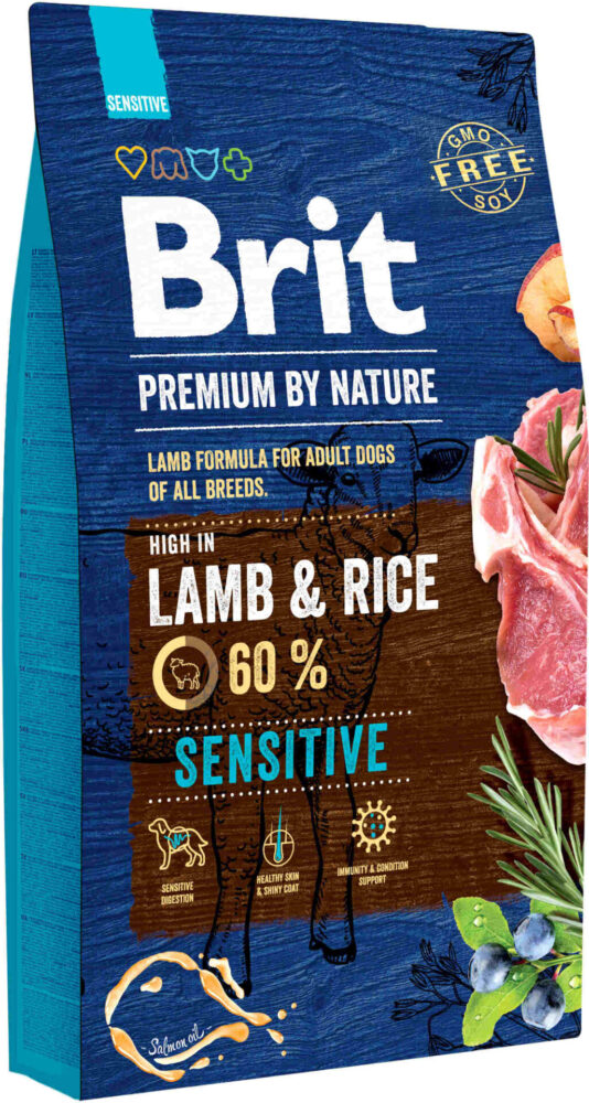 BRIT Premium by Nature Sensitive Miel All BreedHrană uscată completă fără cereale, pentru câini adulţi de toate rasele. Recomandată pentru câini cu un sistem digestiv sensibil.BENEFICII: – digestibilitate ridicată;- o piele sănătoasă şi o blană strălucitoare;- susţinerea imunităţii şi a stării de sănătateCOMPOZIȚIE: miel 35% (deshidratat 20%, dezosat 15%), orez, grăsime de pui (conservată cu tocoferoli), tărâţe de orez, mere deshidratate, ulei de somon (2%), ficat de pui hidrolizat, drojdie de bere, colagen, carapace de crustacee (sursă de glucozamină, 210mg/kg), cartilagiu (o sursă de condroitină, 150mg/kg), ierburi şi fructe (cuişoare, citrice, rozmarin, curcumă, 120mg/kg), Manan-Oligozaharide (120mg/kg), Fructo-Oligozaharide (90mg/kg), extract de Yucca Schidigera (90mg/kg), muşeţel deshidratat (80mg/kg), midii verzi (sursă de glicozaminoglicani 50mg/kg), afine deshidratate (50mg/kg). CONSTITUENȚI ANALITICI: proteină 26%, conţinut în grăsimi 13%, umiditate 10%, cenuşă brută 7%, celuloză brută 3%, calciu 1,6%, fosfor 1,1%, Omega 3 0,2%, Omega 6 1,5%. Energie metabolizabilă 3.660 kcal.ADITIVI/KG: Aditivi nutriţionali: vitamina A (3a672a) 15000UI, vitamina D3 (E671) 1000UI, vitamina E (alfa-tocopherol) 400mg, biotină (3a880) 0,5mg, clorură de colină (3a890) 500mg, chelat de zinc al aminoacizilor hidrat (3b606) 70mg, chelat feros al aminoacizilor hidrat (E1) 60mg, chelat de mangan al aminoacizilor hidrat (E5) 30mg, iodură de potasiu (3b201) 0,5mg, chelat cupric al aminoacizilor hidrat (E4) 12mg, formă organică de seleniu produs de Saccaromyces cerevisiae CNCM I-3060 (drojdia selenată inactivată) 0,2mg. Conţine antioxidanţi aprobaţi de UE: extracte de tocoferol din ulei vegetal (1b306), palmitat de ascorbil (1b304) şi extract de rozmarin.INDICAȚII DE HRĂNIRE ŞI CONDIȚII DE PĂSTRARE: Poate fii servită uscată sau umezită în apă călduţă. Se poate împărţi în 1-2 porţii egale pe durata unei zi. Când oferiţi Brit Premium pentru prima dată, utilizaţi cantităţi mai mici şi amestecaţi cu hrana anterioară, crescând treptat porţia de Brit Premium. Apă proaspătă curată trebuie să fie întotdeauna la dispoziţie. A se păstra în loc uscat şi răcoros, ferit de lumina directă a soarelui. Resigilaţi după deschidere.CANTITATEA ZILNICĂ RECOMANDATĂ: Greutatea corporală a câinelui în kg=cantitatea de produs în grame/zi:5=75 / 10=120 / 15=170 / 20=200 / 25=250 / 30=280 / 40=340 / 50=400 / 60=460 / 70=520 / 80=570 / 90=630 ȚARA PRODUCĂTOARE: EU (Cehia).