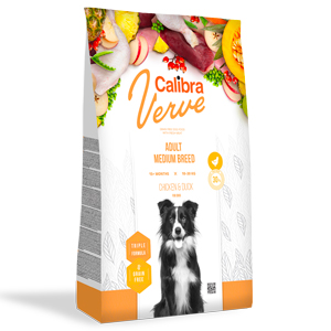 Calibra Dog Verve GF Adult Medium cu Pui si Rata, este o hrana uscata super premium fara cereale pentru caini adulti de talie medie, cu greutatea cuprinsa intre 10 si 30 kg.Calibra Dog Verve GF Adult Medium cu Pui si Rata, este o hrană uscată completă care conține 30% carne proaspătă de pui și proteine de rață de înaltă calitate. Formula activă triplă a rețetei oferă câinelui dvs. o doză regulată de substanțe benefice pentru a sprijini digestia, precum și vitamine și alte substanțe cu efecte antioxidante pentru a sprijini imunitatea.Formula nutritionala contine:· Ananas – o sursă bogată de minerale, vitamine și antioxidanți, conține enzima bromelaină. Aparține grupului de enzime proteolitice – susține digestia și are efecte antiinflamatoare.· Rădăcina de cicoare – o sursă de inulină (fibre solubile cu funcție prebiotică), susține procesele digestive.· Măceșe – o sursă de vitamine (C, E, A, caroteinoide), flavonoide, polifenoli și triterpene. Are efecte antioxidante puternice și ajută la susținerea imunității.În plus, fiecare dintre rețetele Dog Verve conține prebiotice (MOS, FOS, β-glucani) care susțin o digestie usoara și intaresc imunitatea.Compoziție: pui proaspăt dezosat (30%), proteină de rață (26%), cartofi (12%), grăsime de pasăre, proteină de pasăre hidrolizată (6%), dovleac (4%), mazăre (4%), pulpă de mere uscată ( 2%), drojdii, ficat de pui hidrolizat (2%), ulei de somon (2%), pulbere de rădăcină de cicoare (0,2%), măceșe uscate (0,2%), ananas uscat (0,1%), prebiotice (manan-oligozaharide 150 mg / kg, β-glucani 120 mg / kg, fructo-oligozaharide 100 mg / kg), glucozamină (260 mg / kg), sulfat de condroitină (160 mg / kg), yucă Mojave (100 mg / kg)Constituenți analitici: proteină brută 30%, grăsimi brute 17%, fibre brute 3%, cenușă brută 7,5%, umiditate 10%, calciu 1,5%, fosfor 1,2%, sodiu 0,4%, magneziu 0,1%, acid gras omega-3 0,2% , acizi grași omega-6 2,4%
