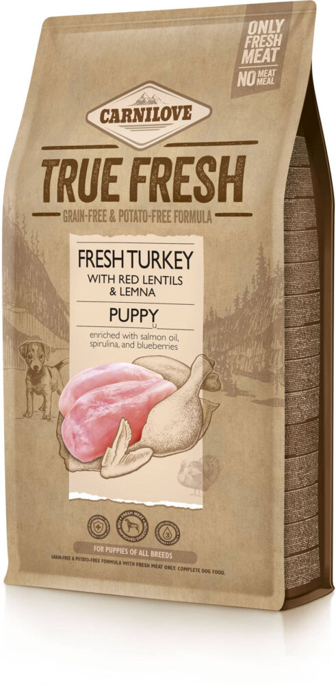 CARNILOVE True Fresh PUPPY, CurcanHrană completă pentru căţei.Formula conţine o proporţie mare de curcan proaspăt din ferme şi surse locale. Uleiul de somon furnizează acizi graşi Omega-3 esenţiali care asigură dezvoltarea corectă a vederii şi a sistemului nervos central. COMPOZIȚIE: curcan proaspăt 60%, mazăre, năut, mere uscate, grăsime de pui (conservată cu tocoferoli), linte roşie 4%, dovleac, ulei de somon 2%, seminţe de in 2%, arome naturale, drojdii hidrolizate ( Saccharomyces cerevisiae) 1%, argilă montmorillonită 0,5%, proteină din Lemna 0,5%, pere uscate 0,3%, cătină uscată 0,2%, rădăcină de ghimbir uscată 0,1%, afine uscate 0,1%, rozmarin uscat 0,1%, afine uscate 0,1%, cimbru uscat 0,1%, glucozamină 0,03%, midii cu margini verzi 0,025%, sulfat de condroitină 0,023%, drojdie de bere (o sursă de manan-oligozaharide) 0,017%, rădăcini de cicoare (o sursă de fructo-oligozaharide) 0,015%, Mojave Yucca 0,011%.CONSTITUENȚI ANALITICI: proteine 28%, conţinut în grăsimi 19%, umiditate 10%, cenuşă brută 7,8%, fibre brute 4,5%, calciu 1,3%, fosfor 0,9%, sodiu 0,25%, acizi graşi Omega-3 1,5%, acizi graşi Omega-6 3,6%, EPA (20:5 n-3) 0,15%, DHA (22:6 n-3) 0,2%.ADITIVI/KG: Aditivi nutriţionali: vitamina A (3a672a) 22.000UI, vitamina D3 (3a671) 1.600 UI, vitamina E (3a700) 550 mg, vitamina C (3a312) 300 mg, taurină (3a370) 1.500 mg, L-carnitină, clorură de colină (3a091) (3a890) 1.800 mg, niacinamidă (3a315) 20 mg, biotină (3a880) 0,7 mg, zinc (3b606) 95 mg, fier (3b106) 80 mg, mangan (3b504) 40 mg, iod (3b201) cupru (3b201) 0. 3b406) 17 mg, seleniu (3b810) 0,2 mg. Conţine antioxidanşi naturali: extracte de tocoferol din ulei vegetal (1b306(i)), palmitat de ascorbil (1b304) şi extract de rozmarin. Energie metabolizabilă: 3800 kcal/kg.INDICAȚII DE HRĂNIRE ŞI CONDIȚII DE PĂSTRARE: administraţi hrana uscată sau uşor umezită. Oferiţi întotdeauna câinelui suficientă apă proaspătă de băut. Cerinţele zilnice nutriţionale ale câinelui pot diferi în funcţie de dimensiunea sa, de vârstă, de performanţă şi de mediu. Pentru a-şi menţine o condiţie fizică bună, asiguraţi-vă că animalul dvs. de companie face o mulţime de exercitii fizice şi nu este hrănit in exces. A se păstra la loc uscat şi răcoros.CANTITATEA ZILNICĂ RECOMANDATĂ: Greutatea corporală a câinelui în kg = cantitatea de produs în grame/zi:Rasele mici (greutate câine adult 5 kg)1-3 LUNI = 50g3-4 LUNI = 70g4-6 LUNI = 75g6-12 LUNI = 70gRasele medii (greutate câine adult 10-20kg)1-3 LUNI = 80-135g3-4 LUNI = 120-180g4-6 LUNI = 130-210g6-12 LUNI = 120-200gRasele mari (greutate câine adult 25-90kg)1-3 LUNI = 140-290g3-4 LUNI = 290-400g4-6 LUNI = 400-650g6-12 LUNI = 440-680g12-18 LUNI = 430-680g18-24 LUNI = 410-660g