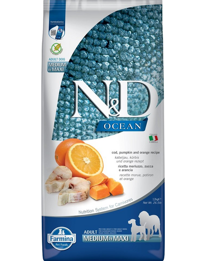 FARMINA N&D Dog Ocean Adult Medium &Maxi Hrana uscata pentru caini de talie medie si mare, cu cod si dovleac 12 kg