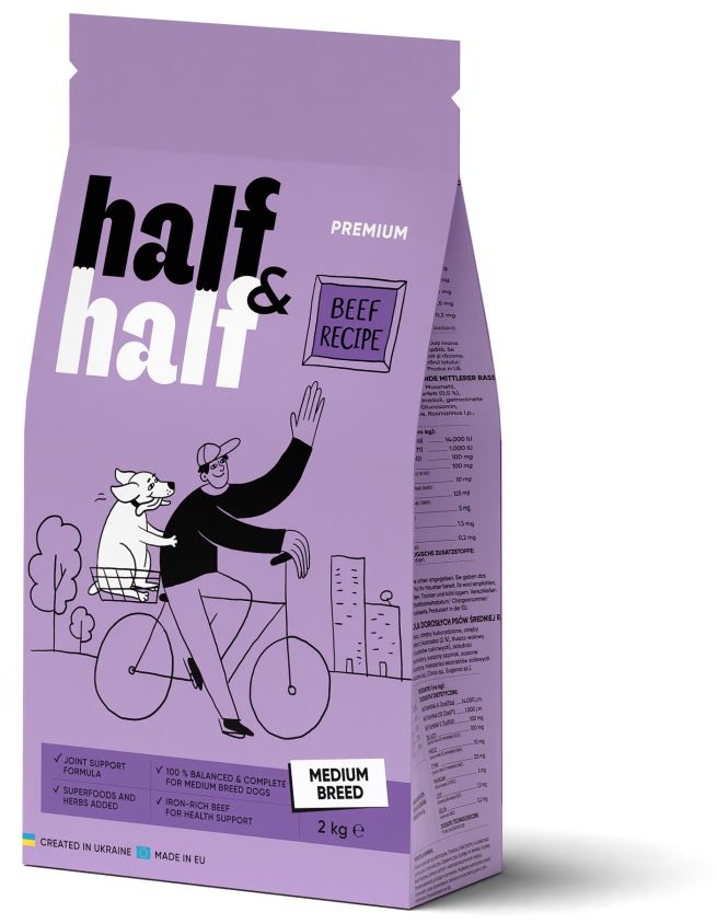 HALF&HALF Hrană uscată pt câini de talie medie, cu Vită Hrană uscată completă pentru câini adulţi de talie medie, cu greutatea cuprinsă între 10 şi 25kg. Oferă câinelui nutrienţii necesari pentru o viaţă sănătoasă şi activă. Îmbogăţită cu fructe, legume, condroprotectori şi plante medicinale, reţeta Half&Half asigură o nutriţie şi un gust excelent în fiecare porţie. BENEFICII:· Proteina din vită este completă, ajută la saţietate şi menţine o condiţie fizică şi greutate corporală optime. · Tărâţele nu sunt doar bogate în vitaminele B, ca fibre brute îmbunătăţesc digestia, peristaltismul intestinal şi ajută la eliminarea toxinelor din organism. · Sfecla şi broccoli ajută la îmbunătăţirea şi optimizarea proceselor de digestie şi susţin sănătatea intestinului. · Glucozamina şi sulfatul de condroitină ajută la întărirea şi sănătatea articulaţiilor, cartilajelor şi mobilităţii. · Amestecul de plante medicinale are grijă de imunitatea puternică a animalului de companie.COMPOZI?IE: vită deshidratată 27%, porumb, uruială din porumb, tărâ?e de grâu, grâu, ficat de pui hidrolizat 2%, grăsime de vită 0,5%, pulpă de sfeclă uscată, minerale, broccoli uscat, ro?ii uscate, spanac uscat, afine uscate, glucozamină, sulfat de condroitină, amestec de extracte de plante (Yucca Mojave, Rosmarinus sp., Curcuma sp., Citrus sp., Eugenia sp.). CONSTITUENTI ANALITICI: proteine 22%, conţinut de grăsimi 9%, cenuşă brută 7,5%, fibre brute 4,5%, umiditate 9%. ADITIVI/KG: Aditivi nutriţionali: vitamina A (3a672a) 14000UI, vitamina D3 (3a671) 1000UI, vitamina E (3a700) 100mg; Oligoelemente: fier (3b103) 100mg, cupru (3b405) 10mg, zinc (3b605) 125mg, mangan (3b503) 5mg, iod (3b202) 1,5mg, seleniu (3b801) 0,2mg. ENERGIE METABOLIZABILĂ: 3349 kcal/kg.INDICAȚII DE HRĂNIRE ŞI CONDIȚII DE PĂSTRARE: Câinele trebuie să aibă tot timpul la dispoziţie apă proaspătă de băut. A se păstra la loc uscat şi răcoros.CANTITATEA ZILNICĂ RECOMANDATĂ: Greutatea corporală a câinelui în kg=cantitatea de produs în grame/zi: 8-10 Kg= 157-186 g10-15 Kg= 186-252 g15-20 Kg= 252-312 g20-25 Kg= 312-369 g25-30 Kg= 369-423 g30-40 Kg= 423-525 g40-50 Kg= 525-620 g