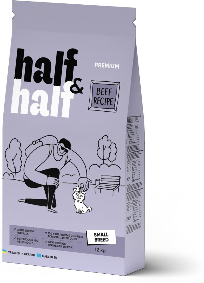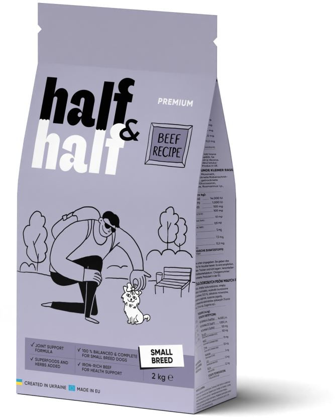 HALF&HALF Hrană uscată pt câini de talie mică, cu VităHrană uscată completă pentru câini adulţi de talie mică şi foarte mică, cu greutatea cuprinsă între 1 şi 10kg. Oferă câinelui nutrienţii necesari pentru o viaţă sănătoasă şi activă. Îmbogăţită cu fructe, legume, condroprotectori şi plante medicinale, reţeta Half&Half asigură o nutriţie şi un gust excelent în fiecare porţie. BENEFICII:· Proteina din vită este completă, ajută la saţietate şi menţine o condiţie fizică şi greutate corporală optime. · Tărâţele nu sunt doar bogate în vitaminele B, ca fibre brute îmbunătăţesc digestia, peristaltismul intestinal şi ajută la eliminarea toxinelor din organism. · Sfecla şi broccoli ajută la îmbunătăţirea şi optimizarea proceselor de digestie şi susţin sănătatea intestinului. · Glucozamina şi sulfatul de condroitină ajută la întărirea şi sănătatea articulaţiilor, cartilajelor şi mobilităţii. · Amestecul de plante medicinale are grijă de imunitatea puternică a animalului de companie.COMPOZIȚIE: vită deshidratată 27%, porumb, tărâţe de grâu, uruială din porumb, grâu, ficat de pui hidrolizat 2%, pulpă de sfeclă uscată, grăsime de vită 0,5%, minerale, broccoli uscat, roşii uscate, spanac uscat, afine uscate, glucozamină, sulfat de condroitină, amestec de extracte de plante (Yucca Mojave, Rosmarinus sp., Curcuma sp., Citrus sp., Eugenia sp.). CONSTITUENTI ANALITICI: proteine 23%, conţinut de grăsimi 9%, cenuşă brută 7,5%, fibre brute 4,5%, umiditate 9%. ADITIVI/KG: Aditivi nutriţionali: vitamina A (3a672a) 14000UI, vitamina D3 (3a671) 1000UI, vitamina E (3a700) 100mg; Oligoelemente: fier (3b103) 100mg, cupru (3b405) 10mg, zinc (3b605) 125mg, mangan (3b503) 5mg, iod (3b202) 1,5mg, seleniu (3b801) 0,2mg. ENERGIE METABOLIZABILĂ: 3352 kcal/kg.INDICAȚII DE HRĂNIRE ŞI CONDIȚII DE PĂSTRARE: Câinele trebuie să aibă tot timpul la dispoziţie apă proaspătă de băut. A se păstra la loc uscat şi răcoros.CANTITATEA ZILNICĂ RECOMANDATĂ: Greutatea corporală a câinelui în kg=cantitatea de produs în grame/zi: 1-2 Kg= 33-55 g2-3 Kg= 55-75 g3-4 Kg= 75-93 g4-5 Kg= 93-110 g5-6 Kg= 110-126 g6-8 Kg= 126-157 g8-10 Kg = 157-185 g