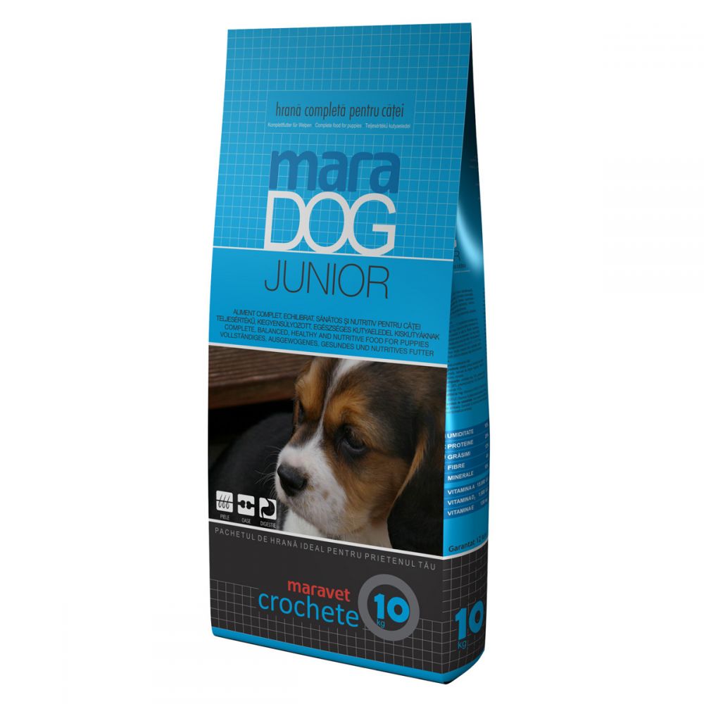 Maradog Junior este o hrana uscata pentru caini juniori de orice talie, aflati in perioada de crestere. Hrana uscata sub forma de crochete hranitoare la sac asigura cainelui necesarul zilnic optim de nutrienti si ofera o stare fizica excelenta cateilor in crestere.Ingrediente: cereale, faina de pasare si subproduse de pasare, derivate de origine vegetala, uleiuri si grasimi, minerale, vitamina A, vitamina D3, vitamina E.Compozitia calitativa per 1 kg: umiditate max.10,0%, proteina min. 28,0%, grasime min.12,0%, minerale 10,0%, fibra 4,0%, cupru 15 mg, vitamina A 15.000 UI, vitamina D3 1,500 UI, vitamina E ( α- tocoferol ) 130 mg, 3780Kcal.Ghid de hranireSe va administra sub forma uscata sau inmuiat in apa calda. Se va asigura apa proaspata in permanenta.Ratia zilnica depinde de varsta, performanta si talia animalului precum si de anotimp.Ratia zilnica: 150 – 210 g pe zi, pentru fiecare 10 kg greutate corporala.