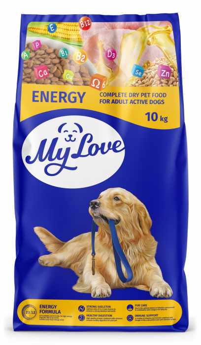 MY LOVE HRANA USCATA COMPLETA PENTRU CAINI ADULTI ACTIVI 10 KG PROTEINE: 23% GRASIME: 12% Compozitie: porumb 38 %, tarate de grau, faina de pui 22 %, grau 7 %, grasime de vita, proteina hidrolizata de pui, pulpa de sfecla de zahar, minerale, ulei…