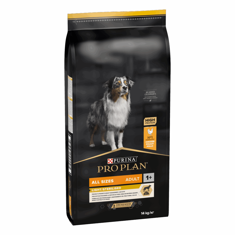 S-a dovedit că susține gestionarea greutățiinCu conținut scăzut de grăsimi pentru a promova pierderea în greutate și menținerea masei corporalenAjută la reducerea senzației de foamenNutriție bazată pe știință, fără adaos de coloranținnUnii câini sunt mai predispuși la creșterea în greutate din cauza unor factori precum niveluri mai scăzute de activitate sau sterilizare. Ne dorim ca toți câinii să ducă o viață sănătoasă și fericită. De aceea, veterinarii și nutriționiștii noștri au dezvoltat special PRO PLAN Light / Sterilised – o hrană pentru câini dovedit că promovează gestionarea greutății ca parte a unei diete echilibrate pentru câini. Hrana uscată pentru câini Purina PRO PLAN Light / Sterlised este facută cu bucăți de pui de înaltă calitate, fiind primul ingredient, și niveluri optimizate de proteine și grăsimi. Un conținut mai scăzut de grăsimi contribuie la reducerea cu până la 60% a grăsimii corporale în decursul a 12 săptămâni și menține ulterior o greutate normală datorită cantității mari de proteine și conținutului scăzut de grăsimi, alături de plimbări zilnice. Hrana uscată pentru câini ajută la reducerea senzației de foame datorită nivelului ridicat de proteine, a surselor complexe de carbohidrați și a nivelului adecvat de fibre. Purina PRO PLAN Light / Sterilised ADULT a fost dezvoltat pentru câinii adulți de toate rasele și taliile. Această hrană uscată pentru câini conține vitamina D, minerale și niveluri specifice de omega-3 (0,3%) pentru a ajuta la menținerea sănătății dinților și gingiilor. Este bogată în pui de înaltă calitate și oferă o nutriție optimă pentru activitatea câinelui tău de la vârsta de 12 luni.nDescoperiți beneficiile pe care produsele LIGHT/ STERILISED le pot aduce sănătății și bunăstării câinelui dumneavoastră.nAcest produs este potrivit pentru toți câinii care au nevoie de controlul greutății, precum și pentru câinii care au fost sterilizați.