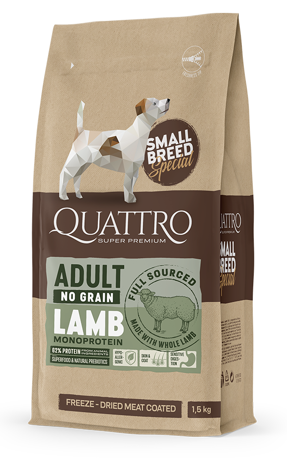 Pentru câini adulți sensibili din rase mici, suspectați de alergii alimentare. CARNE LIOFILIZATĂ ÎNVELITĂ. Gama de produse Quattro este fabricată folosind o tehnologie inovatoare „carne liofilizată învelită”. Această soluție exclusivă permite acoperirea crochetelor cu carne liofilizată, îmbogățind crochetele Quattro cu nutrienți conservați natural și asigurând că animalul dumneavoastră de companie va adora produsul. DIN SURSE COMPLETE. Din surse complete pentru o nutriție completă. Organele furnizează vitamine și minerale esențiale. Cartilajul ajută la menținerea țesuturilor articulare. Oasele și carnea musculară furnizează proteine animale și minerale precum calciul, care susține dezvoltarea corectă a mușchilor și oaselor puternice. FĂRĂ CEREALE. Gama QUATTRO pentru rase mici este fabricată fără cereale precum grâu, soia, orz și alte substanțe care cauzează reacții alergice (gluten, OMG).