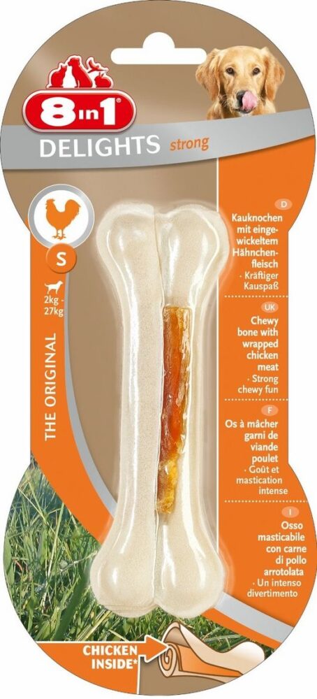8in1 Os Delights Strong S Recompensa sub forma de os, fabricat din piele de vită și piept de pui delicios. Recomandat pentru câinii de talie mica, cu o greutate cuprinsa intre 5 si 10 kg. Datorită consistenței lor ferme, oasele oferă o gustare extra rezistentă și, prin urmare, sunt perfecte pentru câinii cu un instinct deosebit de puternic de a roade. Ajută la controlul acumulării de tartru și placă bacteriană datorită acțiunii lor abrazive naturale în timpul mestecării. Bogat în proteine și nu conține coloranți și potențiatori de aromă artificiali. Caracteristici: Ofera cainilor ore intregi de distractie; Asigura igiena dentara prin curatarea mecanica a dintilor; Distractie de mestecat puternică și de lungă durată Continut redus de grasimi; Nu contine coloranti sau arome artificiale. Recomandare de hranire: Alegeți o recompensa puțin mai mare decât gura animalului dvs. Oferiți întotdeauna apă proaspătă. Compozitie: piele de vită (66%), piept de pui (31%), orez, glicerol, amidon de tapioca, glucoză, sorbitol, clorură de sodiu. Constituenți analitici proteine: 88%, conținut de grăsimi: 2,5%, fibră brută: 1%, cenușă brută: 3%.