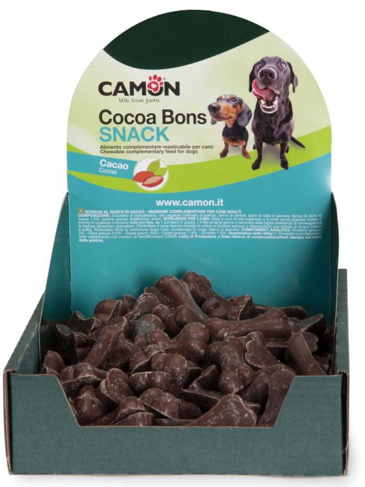 CAMON Recompense pentru câini, oase cu cacao, 5gHrană complementară pentru câini cu vârsta peste 6 luniCOMPOZIȚIE: sfeclă de zahăr, uleiuri vegetale (rafinat de palmier), făină de cereale, zer din lapte, pudră, făină din seminţe de cacap 1,2%, lecitină.ADITIVI: aromeCONSTITUENȚI ANALITICI: proteine 4%, conţinut de grăsimi 45%, fibre brute 0,5%, cenuşă brută 1,5 %, umiditate 1,5%.INDICAȚII DE FOLOSIRE ŞI CONDIȚII DE PĂSTRARE: nu se recomandă utilizarea lor la câinii cu vârste mai mici de 6 luni. Administraţi 1-6 buc/zi ( 1 buc = 5-6 g ) în funcţie de mărimea câinelui, ajustând cantitatea de hrană corespunzător. Supravegheaţi câinele în timp ce consumă hrana complementară. Asiguraţi apă proaspătă la discreţie, permanent. Închideţi pachetul din nou după deschidere. A se păstra la loc uscat şi răcoros.