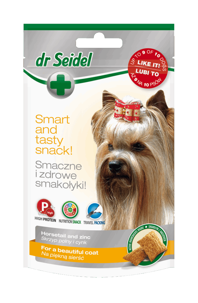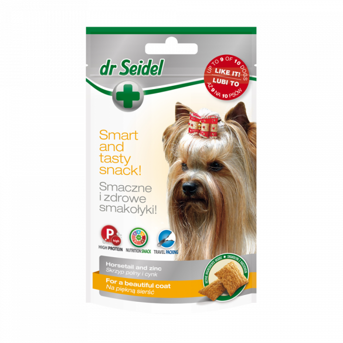 Gustările Dr. Seidel pentru o haină frumoasă sunt gustări pentru câini de valoare completă, îmbogățite cu coada-calului și zinc. Coada-calului imbunatateste aspectul blanii si previne bolile de piele. Zincul sporește imunitatea pielii și accelerează vindecarea rănilor.recomandăriGustări pentru menținerea pielii și părului frumos al animalului. Recomandat în special în timpul năpârlirii, când probleme cu părul și pielea, și înainte de expoziții. Perfect ca gustări între mese sau recompense de antrenament (ca antrenori).substanțe active coada-calului zincContradicții / AtențieNu este necesară suplimentarea cu coada-calului și zinc atunci când utilizați gustări Dr. Seidel.ingredienteFăină de porumb, făină de grâu, drojdie, grăsimi animale, tărâțe de malț, carne de vită uscată, coada-calului, zinc.
