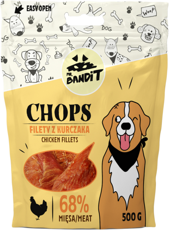 Recompensele Mr. Bandit sunt gustari delicioase si sanatoase, chiar si pentru cei mai mofturosi caini.nSe recomanda administrarea intre mese pentru a oferi blanosului un aport de energie si distractie.nGustarile nu trebuie sa depaseasca 15% din portia zilnica de hrana a animalului.nProdusul nu inlocuieste hrana zilnica.nCainele trebuie sa aiba in permanenta apa proaspata pentru baut.nnCompozitie: Piept de pui 38.5%, proteine din soia, amidon din porumb,proteine din alune, glicerina, conservanti, stabilizatori. Proteine: 38%, Grasime 2%, Fibre 1.5%, Cenusa 3%, Umiditate 20%.