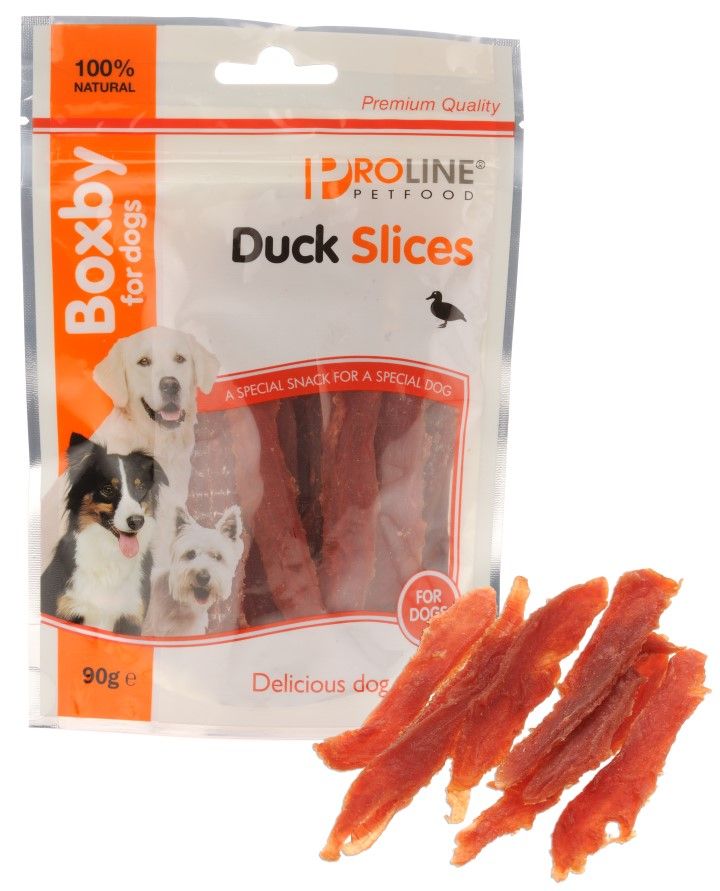 PROLINE BOXBY DUCK SLICES 90 G – Recompense delicioase din carne apetisantă de rață, gustarea perfecta dintre mese.nRecompensele Proline sunt atent formulate si preparate astfel incat sa satisfaca cele mai exigente cerinte si gusturi. Boxby Slices sunt recompensele iubite de toti cateii.- Gust irezistibil- Usor digerabile datorita componentelor naturale- Ideale pentru câinii sensibili la alte tipuri de carne Recomandari de hranire: nncaini de talie mica: 2-4 buc/zincaini de talie medie: 3-6 buc/zincaini de talie mare: 4-8 buc/zinnAmbalaj: 90 g