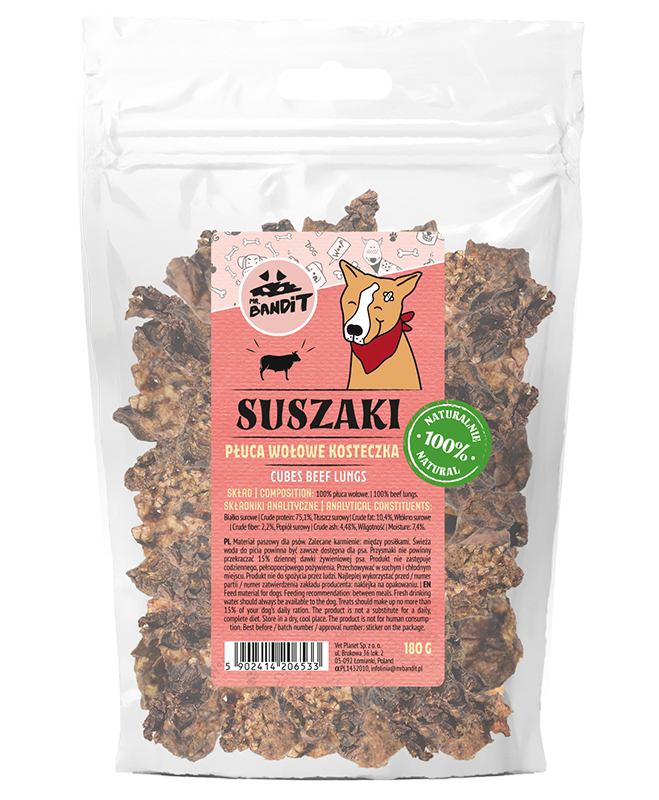 Recompensele pentru câini Mr. Bandit sunt realizate din 100% plămân de vită deshidratat, oferind o gustare bogată în proteine pentru câinii adulți de talie medie. Cu 75.1% proteine, aceste cuburi nu doar că satisfac gustul pretențios al blănosului, dar contribuie și la menținerea unei diete echilibrate. Perfecte între mese, recompensele Mr. Bandit ajută la stimularea energiei necesare pentru joacă și activitate, fiind o alegere optimă pentru orice câine care adoră să rămână activ.O alegere savuroasă pentru câinii mofturoși