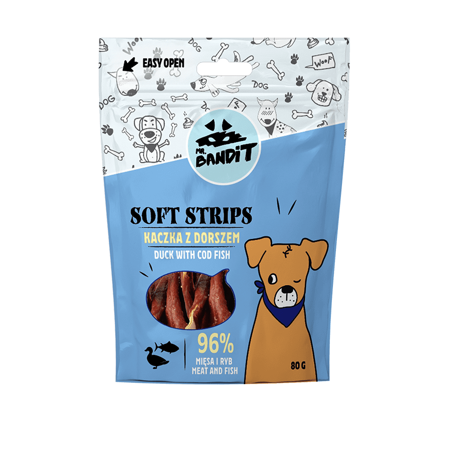 Recompense pentru câini Mr. Bandit SOFT STRIPS, rață și cod, 80 g - Gustări delicioase pentru blănoși mofturoși