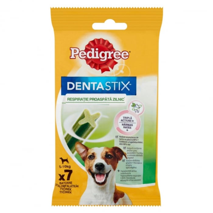 DentaStix Fresh Talie Mica (5-10kg), 7 bucati Hrana complementara pentru caini adulti de talie mica. Pedigree Dentastix Fresh sunt metoda usoara de a pastra dintii cainelui dvs. sanatosi si puternici si de a avea o respiratie proaspata. Pedigree…