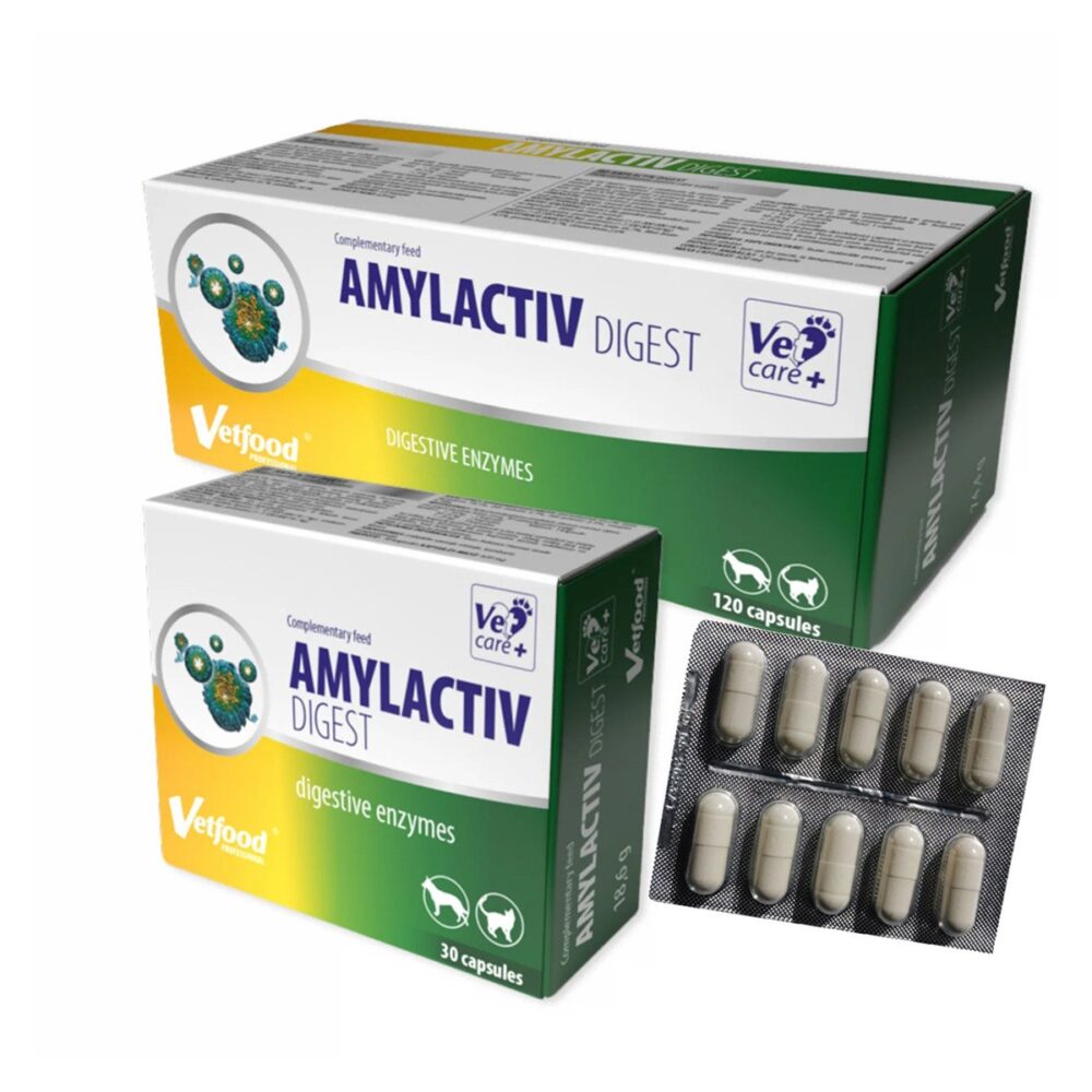 AMYLACTIV DIGEST – supliment nutritiv ce contine o combinatie optima de enzime care participa la digestia nutrientilor: lipaza – grasimi, amilaza – carbohidrati, proteaza – proteine. Specii tinta: caini si pisici. INDICATII: tulburari digestive, sindrom de malabsorbtie insuficienta pancreatica exocrina, pancreatita cronica, rezectia intestinului subtire, stenoza a canalelor pancreatice si biliare, de exemplu asociate cu neoplasme. Eliberarea rapida a enzimelor in duoden ajuta la digestia alimentara a compusilor simpli (acizi grasi, aminoacizi, monozaharide) si imbunatateste procesele de absorbtie, contribuind activ la nutritia celulelor si regenerarea vilozitatii intestinale. Produsul contine, de asemenea, prebiotic – inulina, care ajuta la mentinerea microflorei intestinale sanatoase si asigura buna functionare a tractului digestiv. Produsul se prezinta sub forma de capsule care pot fi deschise si, datorita tehnologiei cu microincapsulare, continutul capsulelor nu va fi dezactivat in pH-ul acid al stomacului. UTILIZARE: Cantitatea recomandata zilnica de produs care trebuie administrata in functie de greutatea corporala a animalului: Animale mici pana la 10 kg greutate corporala – 1 capsula Caini de talie medie 10-25 kg greutate corporala – 2 capsule Caini de talie mare de peste 25 kg greutate corporala – 3 capsule Se recomanda administrarea produsului cu 30 de minute inainte de hranire. Continutul capsulei poate fi amestecat cu mancare pentru caini, hrana umeda sau apa. Daca este necesar, doza zilnica recomandata poate fi impartita in cateva portii mai mici pe parcursul zilei. Compozitie: 1 capsula Lipaza 10 920 UI Amilaza 9 000 UI Proteaza 685 UI Inulina