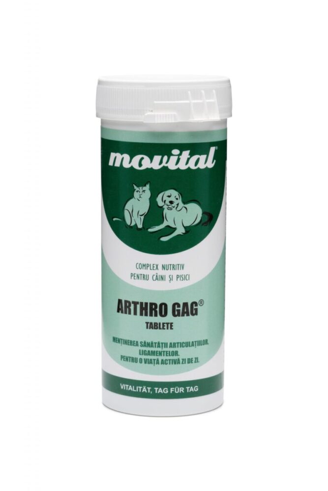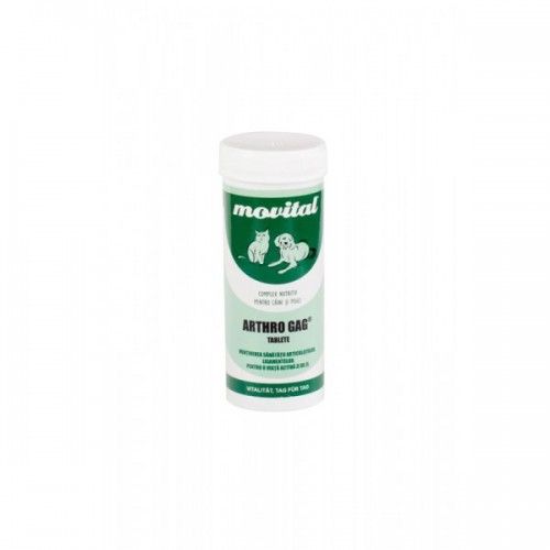 Supliment alimentar pentru caini, destinat problemelor si afectiunilor articulatiilor, ligamentelor, tendoanelor. Pentru combaterea stresului cauzat de antrenamente, concursuri, vanatoare, etc.nProprietati:nMentinerea sanatatii articulatiilor, ligamentelor, pentru o viata activa, zi de zi.nDatorita unui continut bogat de glicozamino glicani, structurile tesuturilor de legatura (tendoane, ligamente, cartilagii articulare si discuri) sunt stabilizate si regenerate.nTabletele de ARTHRO GAG® contin substante naturale, esentiale pentru functionarea eficienta si performanta a aparatului locomotor:- Aminoacizi si faina din alge marine, ce disponibilizeaza rapid sulfuri;- Extract de scoici congelate: furnizeaza tesuturilor de legatura si cartilagiilor articulare glicozamino-glicani, sulfat de condroitina 4 si 6, heparina si sulfat de heparina, precum si acizi grasi cu omega 3;- Vitamina E si Seleniu: ca factori de protectie celulara.nIndicatii:nSupliment alimentar pentru caini, destinat problemelor si afectiunilor articulatiilor, ligamentelor, tendoanelor. In artroze, displazii si spodiloze. Pentru combaterea stressului cauzat de antrenamente, concursuri, vanatoare, gestatie, lactatie.n- Catele : in timpul gestatiei si lactatiei;- Catei : pentru buna crestere si dezvoltare a tesuturilor de legatura ;- Caini performeri: mentinerea vitalitatii si cresterea rezistentei ;- Caini adulti si in varsta: mentinerea unui sistem locomotor functional.