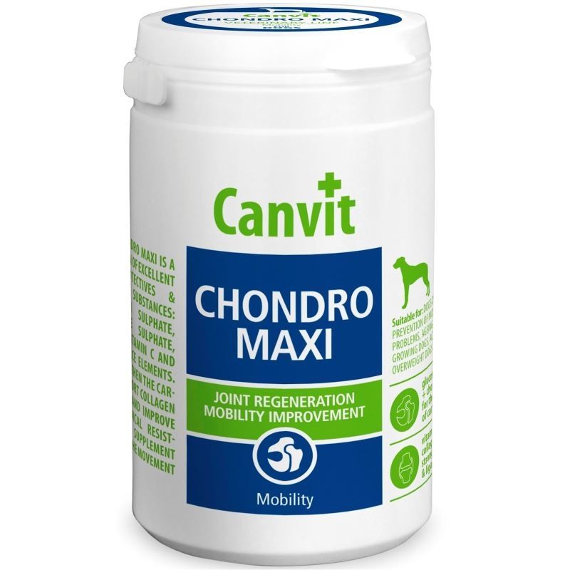 Canvit Chondro Maxi for Dogs, 230 g supliment pentru câini cu greutatea mai mare de 25kg, cu risc sau simptome de probleme de mobilitate, pentru câini în vârstă sau în creştere, câini activi sau supraponderali. Conţine sulfat de condroitină, sulfat de glucozamină, colagen, vitamina C şi oligoelemente organice. Acestea consolidează cartilajul, tendoanele, ligamentele, sprijină formarea colagenului, şi îmbunătăţeşte rezistenţa mecanică.nCOMPOZIŢIE: lactoză uscată, colagen hidrolizat 10%, drojdie de bere uscată, amidon din grâu, sulfat de glucozamină 7,0%, sulfat de condroitină 4,2%, fosfat dicalcic, făină de pasăre, chelat de magneziu 0,17%, oxid de magneziu.nCONSTITUENŢI ANALITICI: proteină 20,5%, cenuşă brută 15%, celuloză brută 7%, conţinut în grăsimi 2%, magneziu 0,35%.nADITIVI/KG: Aditivi nutriţionali: vitamina E 3500mg, vitamina C 7000mg, biotină 100mg, niacinamidă 1500mg, mangan 260mg, seleniu 2mg. Conţine antioxidanţi.nINDICAŢII DE HRĂNIRE ŞI CONDIŢII DE PĂSTRARE: Se administrează tableta pisată în hrană sau se oferă tableta întreagă din palmă pentru minim 8-10 săptămâni. Se poate repeta dupa 3 luni. Nu depăşiţi doza recomandată. Pentru 10kg de greutate corporală: câini tineri sau în creştere: 0,5 tabletă/zi; câini în vârstă: 1-1,5 tablete/zi. A se păstra în ambalaj propriu, în loc uscat, ferit de lumină.