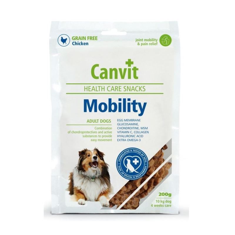 Canvit Health Care Mobility Snack, 200 g este o gustare funcțională pentru câinii adulți și mai în vârstă cu probleme de mobilitate.nCombinația de condroitină, glucozamină și alte ingrediente funcționale contribuie la regenerarea articulațiilor și ajută la îmbunătățirea mobilității.nIngrediente: cartofi, carne de pui ( 15 %), amidon lichid, ulei de hering ( 5%), ficat de pui hidrolizat, colagen, sulfat de glucozamină (15g/kg), membrană de coji de ouă (10g/kg), sulfat de condroitină (8g/kg), metilsulfonilmetan ( 6g/kg), gheara mâței uscată ( 1g/kg).nConstituenți analitici: Proteine brute 16 %, Grăsimi brute 7,5 %, Umiditate 17 %, Pulberi brute 4 % Fibre brute 1,5 %.nSubstanțe suplimentare nutritive per 1 kg: vitamina C 600 mg.