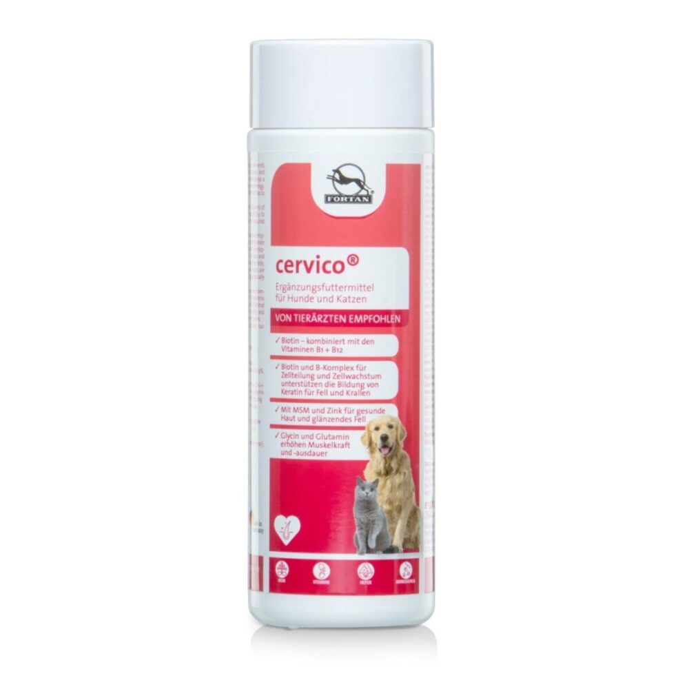 FORTAN Cervico pentru caini si pisici – supliment nutritiv ce previne eczemele, mancarimile, deteriorarea parului si a pielii FORTAN Cervico conține biotină, vitamine B, zinc și proteine de înaltă calitate: Creșterea performanței și a rezistenței generale: -Întărirea mușchilor -Stimulează metabolismul pielii -Prevenirea eczemelor, mâncărimii, leziunilor părului, pielii și cornului ghearelor -Pigmentare optimă Biotina Previne eczemele, mâncărimile, deteriorarea părului, a pielii și a cornului la ghearele la câini și pisici și asigură o pigmentare optimă. În plus, biotina joacă un rol important în metabolismul proteic și energetic. Biotina nu este produsă de organismul câinilor și pisicilor și, prin urmare, trebuie furnizată prin alimente. Toate vitaminele din complexul B pentru câini și pisici FORTAN Cervico conține toate vitaminele complexului B, îmbogățite cu vitaminele B1 și B12. Acest lucru asigură că pielea este aprovizionată în mod optim cu toate vitaminele care sunt deosebit de importante pentru diviziunea celulară. În plus, vitaminele din complexul B conținute în FORTAN Cervico – B1, B2, B6, B12, B15, acid nicotinic, acid pantotenic, acid folic etc. – sunt importante pentru metabolismul carbohidraților, proteinelor și aminoacizilor, pentru blană, creștere. și utilizarea energiei. Zinc Oligoelementul zinc este o componentă a numeroase enzime implicate în metabolismul proteinelor și carbohidraților. Este esențială pentru dezvoltarea normală a celulelor pielii. Necesarul de zinc poate crește la câinii cu păr lung, mai ales în timpul schimbării hainei, din cauza unei nevoi crescute. Modificările pielii și ale blanii sunt de obicei primele semne ale deficienței de zinc la câini și pisici. Acidul fitic din ingredientele din cereale sau soia afectează absorbția zincului și face necesară suplimentarea cu zinc a rației de hrană. Proteine de înaltă calitate FORTAN Cervico contine proteine de inalta calitate din drojdii valoroase, formate din aminoacizi precum arginina, asparagina, acid glutamic, glicol, histidina, izoleucina, leucina, lizina, metionina, fenilalanina, treonina, triptofanul si valina. Aminoacizii esențiali trebuie să fie furnizați prin alimente, deoarece organismul nu îi poate produce singur. Conținutul ridicat de aminoacizi îmbunătățește utilizarea proteinelor animale și vegetale furnizate în furaj. Hrana suplimentara pentru caini si pisici Compoziţie: Drojdii, MSM (metil sulfonil metan) Componente analitice: Proteine brute 47,8%, cenușă brută 6,9%, uleiuri și grăsimi brute 3,9%, fibre brute 1,7% Aditivi nutritivi per kg: Biotină din D-(+)-biotină (3a880) 200 mg, vitamina B1 (3a821) 1.000 mg, vitamina B12 5.000 μg, L-glicină 20.000 mg, acid L-glutamic 2.500 mg Oligoelemente: 250 mg zinc (3b603) din oxid de zinc Recomandare de hrănire: Greutate Lingurite / zi sub 5kg ½ lingurita 5 – 10kg 1 lingurita 10 – 15kg 1½ lingurite 15 – 20kg 2 lingurite 20 – 30kg 3 lingurite 30 – 40kg 4 lingurite peste 40kg 5 lingurite Dozare: 1 lingurita = aprox. 2.0 grame SFAT: FORTAN Cervico poate fi amestecat in hrana zilnica