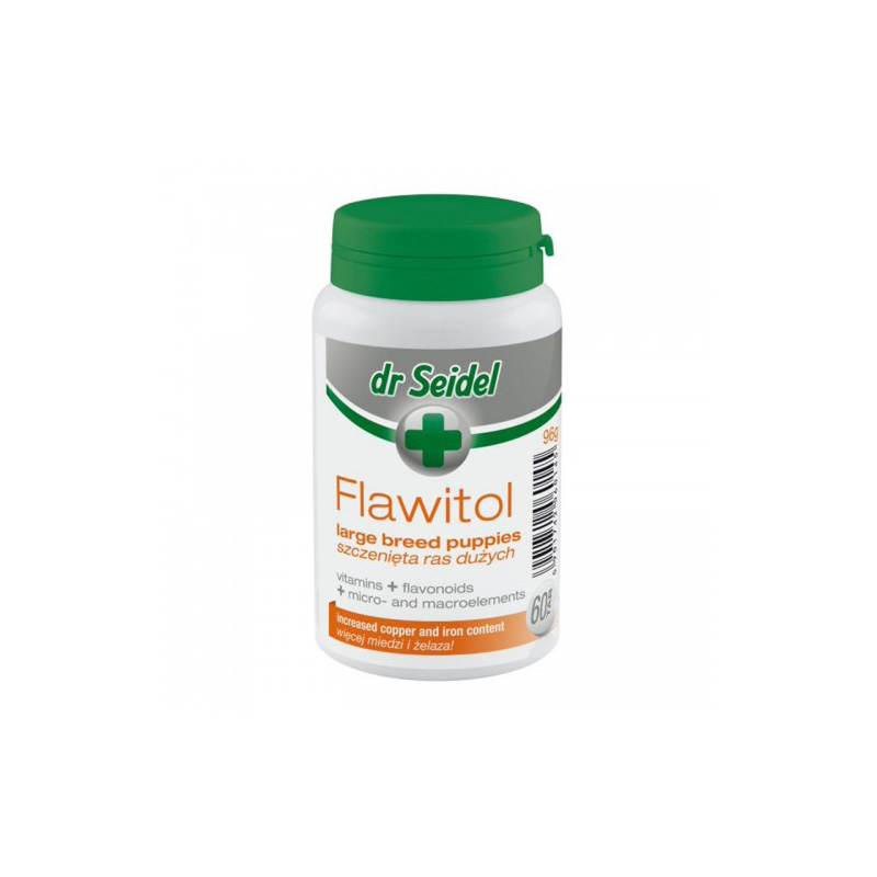 Flawitol Puppy Large Breed 60 tablete – complex de vitamine, flavonoizi, microelemente si macroelemente esentiale cresterii si dezvoltarii sanatoase a puilor de caini de talie mare. – Protejează împotriva radicalilor liberi, adaptat în mod specific la nevoile crescute ale organismului în creştere. – Folosirea regulata a preparatului asigură dezvoltarea adecvată a tuturor organelor,COMPOZITIECompoziție: drojdie de bere, fosfat dicalcic, amidon.Aditivi (în 1,6 g tabletă): flavonoide 16mg, magneziu 0,4mg, vitamine: A 929UI, D3 101UI, E 5mg, B1 0,3mg, B2 0,5mg, B6 0,3mg, B12 4,6μg, acid folic 41μg, acid pantotenic 1,9mg, biotină 18,3μg, zinc 8,9mg, fier (chelat) 28,5mg, cupru (chelat) 1,5mg, iod 0,1mg, seleniu 27,4μg, magneziu 0,7mg, aditivi tehnologici.Constituenți analitici: proteină 19,1%, grăsime 1,8%, fibre 1,4%, cenușă 32,9%, calciu 8,5%, fosfor 5,3%, sodiu 0%.MOD DE ADMINISTRARE:1 tabletă / 6 kg greutate corporală. – Se administreaza pe cale orala impreuna cu hrana. – In perioada de crestere pana la varsta de 7-8 luni.Furaj complementar pentru cățeluși de talie mare cu vârsta