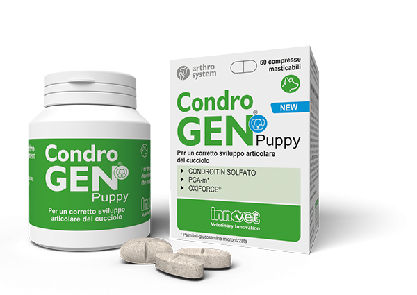 Sănătatea articulațiilor este cheia mișcării și, prin urmare, a bunăstării generale a câinelui.nCondrogen® Puppy este indicat pentru dezvoltarea corectă a articulațiilor în timpul fazei de creștere a cățeilor de rasă mare/gigant.Condrogen® Puppy nu este un medicament veterinar. Este o hrană complementară pentru câini.nSulfatul de condroitină, un constituent normal al matricei cartilajului, hrănește cartilajul articular contribuind astfel la dezvoltarea corectă a acestuia.Palmitoil-glucozamina (PGA) este o sursă de glucozamină cu eliberare lentă (blocul constitutiv al cartilajului) și contribuie la echilibrul natural al celorlalte componente articulare. Condrogen® Puppy conține PGA-m, o formă exclusivă de PGA care îi asigură o biodisponibilitate mai mare datorită unui proces inovator de superreducere a particulelor (micronizare).Oxiforce® este o combinație inovatoare de SOD (superoxid dismutază) și nucleotide care optimizează creșterea țesuturilor moi (mușchi, tendoane și ligamente), îmbunătățind astfel stabilitatea articulațiilor.