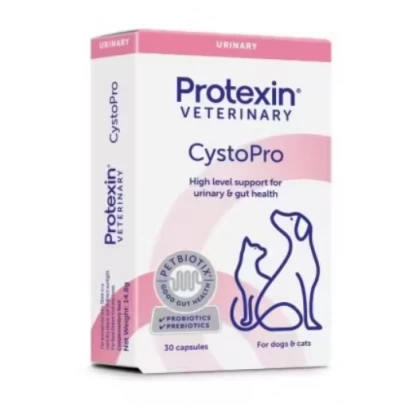 Protexin CystoPro pentru Caini si Pisici Protectie avansata pentru sanatatea tractului urinar la caini si pisici Un sistem urinar sanatos este esential pentru starea generala de bine a animalului tau de companie. CystoPro de la Protexin ofera un nivel ridicat de sprijin pentru functionarea optima a vezicii urinare si a tractului urinar, fiind potrivit atat pentru caini, cat si pentru pisici. Formula sa combina ingrediente active cu efect dovedit in sustinerea mucoasei urinare si in prevenirea atasarii bacteriilor pe peretele vezicii. Beneficii : Proantocianidine din afine (Vaccinium macrocarpon) , inhiba atasarea bacteriilor de peretii tractului urinar. N-acetil-D-glucozamina , sustine stratul protector al vezicii urinare (GAG). Manan oligozaharide (MOS) , contribuie la neutralizarea bacteriilor daunatoare. Enterococcus faecium (probiotic) , ajuta la echilibrarea florei intestinale, cu efect indirect asupra sanatatii urinare. Compozitie per capsula: 20 mg Proantocianidine din afine 125 mg N-acetil-D-glucozamina 4,0 Ãmdash; 10, CFU Enterococcus faecium Manan-oligozaharide, stearat de magneziu Mod de administrare: 20 kg greutate corporala: 1 capsula zi 20, 40 kg greutate corporala: 2 capsule zi 40, 60 kg greutate corporala: 3 capsule zi Capsula poate fi administrata intreaga sau desfacuta, iar continutul poate fi amestecat cu hrana umeda sau uscata. Utilizati zilnic, atat timp cat este necesar, sau conform indicatiilor medicului veterinar. Recomandat pentru: Sustinerea sanatatii tractului urinar (infectii recurente, cistite) Animale predispuse la probleme urinare Protectie pe termen lung, in special la animalele sensibile Cu Protexin CystoPro , ai grija de sanatatea urinara a companionului tau cu o formula completa, sigura si usor de administrat. Pentru confort zilnic si un sistem urinar protejat , alegerea corecta pentru caini si pisici de toate varstele.