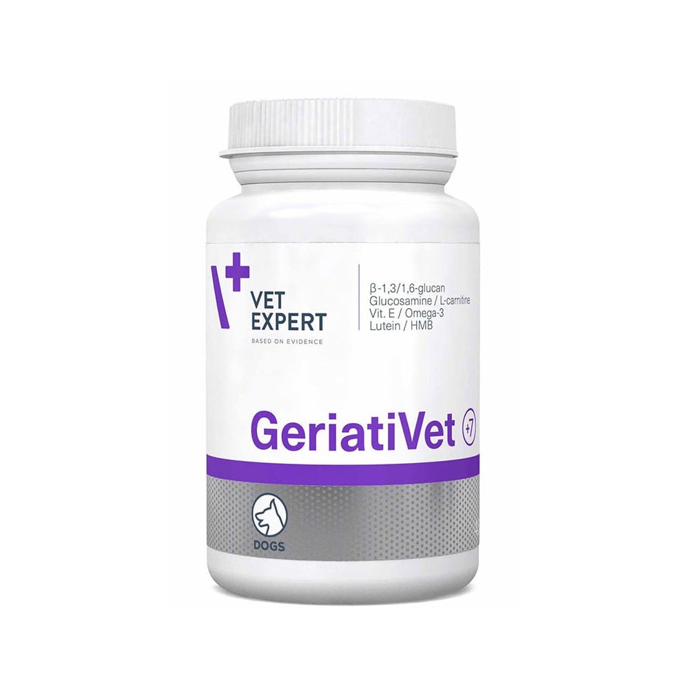 GERIATIVET DOG – Supliment nutritional pentru cainii batrani Indicatii: Produsul se recomanda in tratarea cainilor in varsta care datorita imbatranirii au nevoie de un aport crescut de substante ce ii pot proteja de tulburari diverse, specifice inaintarii in varsta. Elementele care intra in compozitia produsului sprijina sistemele si organele cheie ale seniorului. GeriatiVet intareste imunitatea si imbunatateste digestia, sprijina functiile cardiace si articulare, faciliteaza arderea grasimilor, aduce un aport important de antioxidanti si substante care protejeaza tractul urinar, ajuta la pastrarea conditiei fizice, prin substantele care impiedica pierderea masei musculare. Specii tinta: caini Mod de administrare: 1. GeriatiVet Small 1 tableta / 7.5 kg greutate corporala/ zi 2. GeriatiVet Medium & Large 1 tableta / 15-30 kg greutate corporala/ zi 2 tablete