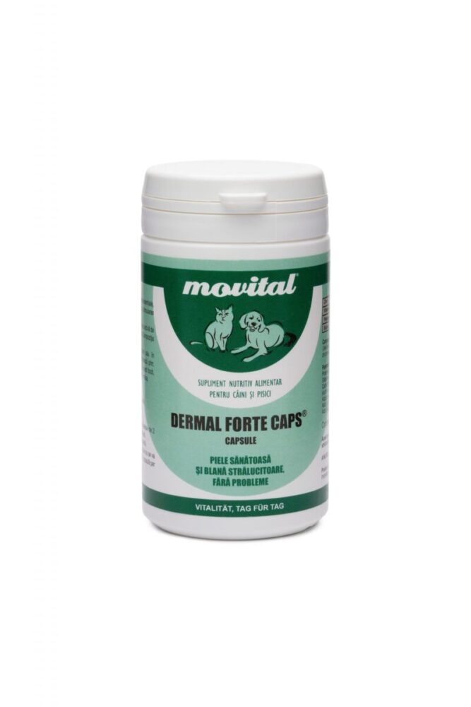 Pentru o piele sanatoasa si o blana stralucitoare, fara probleme.COMPOZITIA PER 1000 ml:- Ulei de animale marine,ulei de plante (ulei extras din primula de noapte)- Zinc 1.025 mg,- Vitamina A 957.101 UI- Pantotenat de calciu – D 6.838 mg- Biotina 34.182 mgCOMPOZITIE PER CAPSULA:- Zinc 0,30 mg- Vitamina A 280 UI- Pantotenat de calciu – D 2,00 mg- Biotina 10,00 mgPARAMENTRII ANALITICI:Proteina bruta 22,20%;Grasime bruta 65,10%;Carbohidrati 2,30%;Acid linoleic 37,00%;Acizi grasi cu Omega 3 – 2,30%;Acizi grasi cu Omega 6 – 42,00%;Acizi grasi cu Omega 9 – 4,60%Combinatia de acizi grasi polinesaturati si ingrediente esentiale, cu efect imediat asupra pielii, prin activarea si stimularea metabolismului pileii si parului. DERMAL FORTE CAPS contine o combinatie foarte activa de substante cu actiune benefica asupra dermului.Insuficeinta aportului acestor substante (singure sau in combinatie) in organismul animal se caracterizeaza prin: piele uscata cu prezenta de matreata, blana cu aspect tocit, caderea parului si predispozitie la diverse afectiuni dermice.RECOMANDARI PRIVIND ADMINISTRAREA:Se administreaza oral ca atare sau amestecat in hrana/ zi- Caini: 1 capsula per 10 kg greutate corporala- Pisici: 1 capsula pe ziIn cazurile severe se va incepe un tratament intensiv de 2 saptamani, apoi se va administra de 3 ori pe saptamana.In scop preventiv se va administra de 2 ori pe saptamana.Datorita continutului relativ mare de Vitamina A si Zinc nu se va depasi doza maxima zilnica recomandata (caine 1 capsula per 10 kg g.c.; pisica 1 capsula pe zi).CONTINUT NET:40 g (100 capsule)