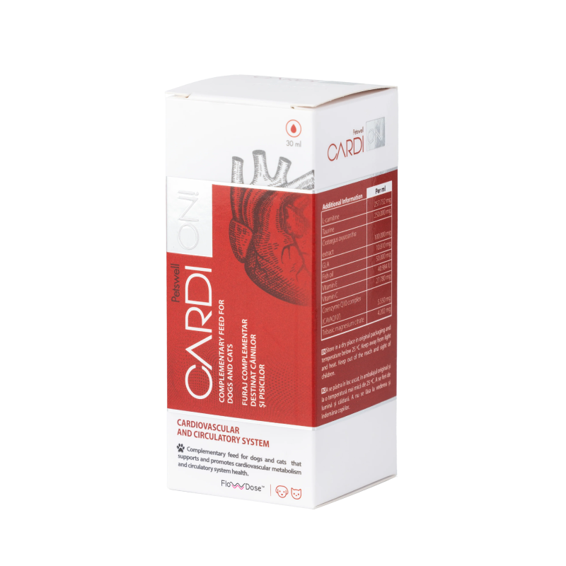 Supliment nutraceutic destinat câinilor și pisicilor care susține și promovează metabolismul cardiovascular și sănătatea sistemului circulator.- încurajează bună funcționare a sistemului cardiovascular- susține funcția cardiacă și încurajează contractilitatea miocardului- reduce stresul oxidativ- suport geriatric, în special pentru câinii și pisicile cu predispoziție de boală cardiacăDe ce sa alegi CARDI-ON?Conține absolut toate elementele dovedite clinic că ajută la menținerea sănătății sistemului cardiovascular.Combinația unică și ideală de substanțe active susține metabolismului sistemului cardiovascular- mai mult vezi în secțiunea de mai jos;Inglobează 2 tehnologii inovatoare Flowdose™ și CAVAQ10Flowdose™ este inovația tehnologică care garantează administrarea simplă a dozei ideale. CAVAQ10® este tehnologia brevetată de livrare a Coenzimei Q10 care îmbunătățește biodisponibilitatea și eficiența acesteia de până la opt ori față de preparatele clasice cu Coenzima Q10.Ușurința în administrare asigură în mare măsură succesul planului terapeutic. Alături de tehnologia Flowdose™, flaconul cu sistem airless care permite administrarea produsului ținând flaconul în orice poziție și prezentarea sub formă de gel sunt atributele care oferă cea mai bună experiență posibilă în administrarea produsului .